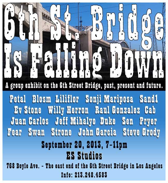 Our fellow artists want to bring awareness to the community on this topic by uniting and exhibiting a tribute to the 6th Street Bridge tomorrow night! I got to hang out at their venue tonight and got a sneak peek of some of the amazing and truly awesome art of some of the artists that are part of the exhibit. And I must say that although all of these artists come from very different backgrounds; their unique styles under one bridge will not only leave you nostalgic for the fact that this bridge will soon be gone, but it will also give you the opportunity to experience a piece of history from various points of views.